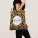 Eine Tasche mit einem stilvollen Muster. Exotische schwarze Leoparden auf einem goldenen Hintergrund. Wilder und dennoch eleganter Stil. Oben platziert ist ein weißer Rahmen mit einem goldenen Rahmen aus Imitat, in dem der personalisierte Monogramm-Initial und Name enthalten ist.