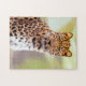 Leopardenfoto, das Sie direkt anschaut, nah mit seinen gelben/grünen Augen und der grünen Hintergrundfarbe. Schöne große wilde Katze / wilde Tiere Bild.