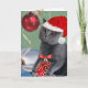 Christmas Cards featuring Gray Cat playing with Christmas Bulbs while wearing Santa a against backdrop of snow.