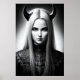 Portrait noir et blanc d'une jeune dame démoniaque aux cheveux blonds longs et à la corne. C'est un art généré par l'IA.