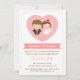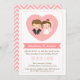 Une invitation à invitation les invités mariages à une fête de brunch post-mariage. Elle contient une jolie caricature de jeunes mariés, le marié dans un smoking noir acéré, un pantalon gris et une joyeuse cravate d'arc rose et la mariée dans une robe blanche élégante et classe, un voile et une bague de fleurs pour ses cheveux. Une grande forme de coeur rose les entoure. Page inversée de motif de chevron rose et blanc.