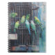 Cette couverture de carnet présente une oeuvre colorée et texturée de perroquets verts et bleus perchés dans une cage métallique rustique. Le style peint et les tons patinés évoquent à la fois la beauté et la contemplation, capturant des thèmes de liberté, de compagnonnage et d'immobilité. Parfait pour la journalisation, l'esquisse ou les réflexions quotidiennes.