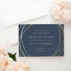 Annoncez votre date et votre emplacement mariage dans le style moderne chic avec ces cartes de date élégantes enregistrer les détails abstraits et géométriques sur un arrière - plan bleu marine fumé. L'avant présente vos détails mariages en lettrage moderne minimaliste, encerclé par des formes de sphère irrégulières en or élégant. Ajoutez des détails supplémentaires, comme votre site Web mariage, à l'arrière.