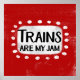 "Trains Are My Jam" est un design de texte amusant avec une forme d'accent blanc entourée de points blancs texturés.