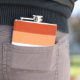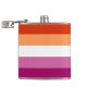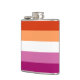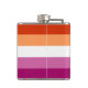 Vinyl-Flasche mit der lesbischen Stolzflagge. Orangefarbene, weiße und rosa Fahne der lesbischen Stolzbewegung