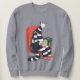Buchliebhaber Sweatshirt mit einer lustigen Illustration einer seltsamen, schwarz-weiß gestreiften Katzenkreatur mit langen Nacken bleibe auf Zuhause. Dieser seltsame Charakter bleibe Zuhause, sitzt friedlich auf einem orangefarbenen Stuhl mit Augen, entspannt und liest ein rätselhaftes Buch. In den Hausschuhen, die mit den Augen geschmückt sind, genießt es eine heiße Tasse Kaffee.