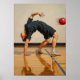 Ein dynamisches Art Deco Ölgemälde, das eine Dodgeballspielerin in einem dramatischen, anmutigen Rückbogen abbildet, ihre stilisierte geometrische Form, definiert durch sanfte chiaroscuro Beleuchtung, da sie einen roten Ball vermeidet.