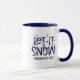 This ceramic coffee mug is shown in a festive holiday print let it snow somewhere else.