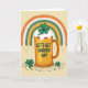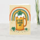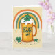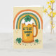 This card shows a golden beer mug centered on a creamy beige background, topped with fluffy white foam where an emerald shamrock pops up like a little lucky surprise 💚. Across the middle of the mug, the phrase “LET’S GET LUCKED UP!” sits in bright blue letters, standing out clearly against the warm gold. Above it, a rainbow curves along the top edge, with bands of orange, white, deep green, and ochre that feel like a friendly nod to Irish colors ☘️. Tiny white dots and a speckled texture run through the rainbow, giving it a soft, cozy look, like something you’d point out to a close friend with a grin. The mug’s glow and the gentle background shading make the center feel inviting, as if two pals are about to clink glasses and lean in for a laugh. Along the bottom, scattered shamrocks and confetti-like dots in greens, oranges, and golds form a loose border that frames the scene. The lower foreground is sprinkled with small green clovers and round dots that trail from left to right beneath the mug.