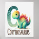 Uppercase Letter C, Dinosaurier Alphabet Watercolor Poster Dieses 8.5x11 Poster für den Buchstaben "C" fügt einen Splash of charm mit einem fröhlichen Corythosaurus an seiner Seite hinzu. Der Buchstabe "C" kurbelt anmutig in aquamarinem Schatten mit spielerischen weißen Flecken, wodurch ein dynamischer Rahmen für die Szene entsteht. Der Corythosaurus ist mit einem süßen Lächeln versehen und zeigt einen farbenfrohen Regenbogen von gelb und orange bis aquamarin und rosa. Der polka-gepunktete Körper und die farbenfrohen Rücken-Teller machen ihn zu einem lustigen und freundlichen Dino. Das Wort "CORYTHOSAURUS" wird unten deutlich in fett braunen Buchstaben gedruckt, was es Kindern leicht macht, den Brief mit dem Dinosaurier zu verbinden. Dieses Poster setzt die reizvolle Dinosaurier-Alphabet-Serie fort und bringt Lernen und Farbe in einer Weise zusammen, die junge Fantasie einfängt.