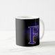 Mok met de letter F. (bijvoorbeeld je initiaal) Leuk als je naam met de F begint of die van een ander. Achter de letter is een raster en mysterieuze wolken met een licht die erop schijnt. De letter F is gevuld met een plaid patroon en een grijze rand erom heen. kleuren blauw, paars, geel en zwart.