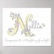 Hübsches N-Monogramm-Artenposter, ideal für ein Mädchenschlafzimmer oder ein Spielzimmer in Grautönen, Weiß, Gelb, Rosa und lila. Personalisieren Sie mit dem eigenen Namen Ihres Kindes, beginnend mit N, und Name bedeutet für ein wirklich personalisiertes Geschenk für Ihr Kinderzimmer oder Kinderzimmer, dieses Beispiel ist für den Namen Nellie Compassionate. Ein heller Sonnenstrahl. Niedlicher Plakatdruck ideal für ein neues Baby-, Taufen- oder Babyduschgeschenk. © Einzigartiger Buchstabe N Art Monogramm mit Herz und Blume zeichnend zu einem grafischen Kunstdesign von Sarah Trett. www.sarahtrett.com für www.mylittleeden.com