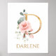 Élégante affiche de pépinière monogramme de la lettre D avec rose de pêche rose aquarelle et feuillage vert.