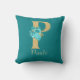 Joli oreiller jeté avec lettre de parties scintillant d'or 'P' avec aqua roses et bouquet de fleurs d'or sur un arrière - plan turquoise. Personnalisez avec le nom dans la police de couleur or.