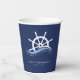 Nautische blaue und weiße Brautparty / Junggeselinnen-Abschied Papier Becher mit Schiff Helm und Phrase "letzte Segel vor dem Schleier". Personalisieren Sie es mit Ihren Veranstaltungsdetails.