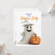Moderne Halloween-Party Einladung mit HAPPY GHOST MIT JACK-O-LANTERN Illustration auf weißem Hintergrund. Einfach, modern und nicht beängstigend.