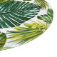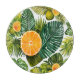 Das Bild entfaltet eine strahlende Melodie aus üppigen grünen Monstera- und Palmenblättern, die sich mit saftigen Orangenscheiben und exotischen Früchten in leuchtendem Gelb und Orange vereinen. Der lebendige Kontrast auf einem hellen Hintergrund verleiht eine fröhliche, tropische Wärme, die Energie und einen Hauch von Paradies ausstrahlt.