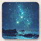 Landschaftliches Bild des eisigen Nordens, wie man nachts sieht. Leuchtende Sterne und himmlische Formen sind zu sehen, blinkend, leuchtend und hell. Sie erhellen das felsige Gelände unten. Dunkelblaue Schatten werden in der Ferne auf die Felsen und das Eis geworfen.