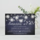 Unsere rustikalen, eleganten Probe-Dinner oder Cocktail-Party Einladungen in einem reich strukturierten Mitternachtsblauen Hintergrund mit Streichern aus Weißlichtern und leuchtenden Papierlaternen über dem Gipfel, und "morgen machen wir" in chic Kalligraphie Schrift Typografie. Personalisieren Sie Ihre Zeremonie Probe und Probe Dinner Details unten. Enthält Platz für den Zeitpunkt der Probe und die Kirche- oder Veranstaltungsadresse.