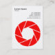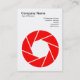 Eine Visitenkartenvorlage mit einem fett gedruckten Blendensymbol. Firmenname, Geschäftstyp und Adresse auf der Vorderseite mit Namen, Jobtitel, Telefonie, Web- und E-Mail-Adressen auf der Rückseite, mit dem gleichen Layout.