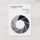Eine Visitenkartenvorlage mit einem fett gedruckten Blendensymbol. Firmenname, Geschäftstyp und Adresse auf der Vorderseite mit Namen, Jobtitel, Telefonie, Web- und E-Mail-Adressen auf der Rückseite, mit dem gleichen Layout.