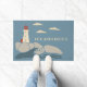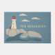 Dieses personalisierte Haus ist ideal für Ihre Hütte am Meer oder für andere Strandhäuser. Es hat eine einfache Darstellung des nautischen Stils eines Leuchtturms in Rot und Creme oder Elfenbein. Der Leuchtturm liegt an einem felsigen Ufer mit unter ihm abstürzenden Wellen und cremefarbenen Wolken am Himmel. Die Grafik ist Set vor einem weichen, französischen blauen Hintergrund.