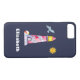Ein personalisierter Handy mit einem nautischen Thema. Navy Hintergrund. Ein rot gestreifter Leuchtturm und ein Beachball, mit einer lächelnden Sonne und einem fliegenden Seagull in der Ferne.