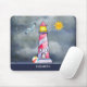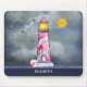 Eine Maus mit einem nautischen Thema. Entworfen mit einem rot gestreiften Leuchtturm und einem Beachball. Eine lächelnde Sonne und fliegender Seegras in der Ferne. Ein Aquarellhintergrund in Grau und Blues, der wie schwache Sturmwolken aussieht. Personalisieren mit einem Namen.