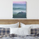 Impression paysage de toile verticale d'un lever de soleil brumeux avec un ciel rose et brouillard entre les collines toscanes au-dessus de l'agriturismo podere il Belvedere ferme dans la Valdorcia (Vallée d'Orcia) entre Pienza et San Quirico en Toscane, Italie.
