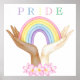Stolze Aquarellfarben Beschreibung der Regenbogenfarben und Hände in rosa Blume über weißem Hintergrund. Egal, welche Orientierung Sie haben und welche Hautfarbe Sie haben, Sie sind immer noch ein Mensch.