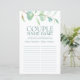 Dieses botanische Eukalyptus LGBTQ Coupe Name Game Polterabend Spielblatt bringt Ihnen viel Spaß und Lachen! Die Seite ist elegant und modern zugleich. Sein schönes Design mit einem Stück Eukalyptus in zeitgenössischem Aquarellstil ist perfekt für jede Hochzeit. Um dieses Spiel zu Ihrem eigenen zu machen, wählen Sie einfach diese Vorlage personalisieren und geben Sie die Namen des glücklichen Paares ein.
