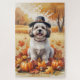 Ein Aquarellbild eines fröhlichen Hundes inmitten eines Haufen lebendiger Herbstlaub, umgeben von winzigen Kürbissen und verstreuten Eichhörnchen. Der Hund trägt einen kleinen Pilgerhut und strahlt vor Freude aus, um den Geist des Erntedanks zu erfassen. Im Hintergrund sorgen weiche Erntefelder und goldfarbene Bäume für eine friedliche Landschaft. Die sanfte Struktur und die warmen, gedämpften Herbsttöne verleihen der Szene ein gemütliches, nostalgisches Gefühl, das perfekt ist, um die Schönheit der Saison zu feiern.