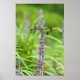 Eine Libelle, die vorübergehend auf eine vertikale Reihe violetter Blumen blitzt.