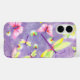 Abstrakte Libellen und Blitzkäfer auf lila Stoff.