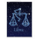 Karte mit dem Zodiaksymbol für Libra in weichem silberblauem Weiß, überlagert mit den Sternen der Sterne, vor einem Sternenhimmel, der von tiefer Mitternacht blau bis schwarz gestuft wird.