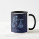 Tasse mit dem Sternensymbol für Libra in sanft silberblau, überlagert mit den Sternen des Sternbildes, vor einem Sternenhimmel, der von tief Mitternachtsblau bis schwarz gestuft wird