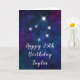 Diese kosmische und himmlische Geburtstagskarte kann mit einem Namen oder Titel wie Mutter, Tochter, Enkelin, Nichte, Freundin etc. personalisiert werden. Das Design zeichnet sich durch die Tierkonstellation der Libra auf einem dunkelblauen und lila Aquarellhintergrund mit verstreuten Sternen aus. Der Text kombiniert handgeschriebene Skripte mit modernen Serif-Schriftart für ein stilvolles und klassisches Aussehen. Das ist perfekt für jeden, der sich für Sternzeichen und Astrologie interessiert.