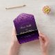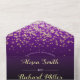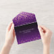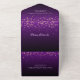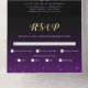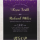 Die lila Winternachtsszene mit hellen Lichtern im Himmel lädt zum Verweilen ein. Weiße und blassgelbe Lichter, die auf lila Gradientenhintergrund strahlen. Die Namen sind in der Skripttypografie, und der Riss von der RSVP-Karte kann gelöst werden.