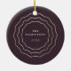 Dieses elegante Keramik-Ornament mit einem Foto auf der Vorderseite und einer Beschriftung auf der Rückseite, umgeben von einem dreifachen geometrischen Rahmen in Imitaten Goldfolie auf einem reichen Auberginen-Pflaumenboden. Dieses schicke Design eignet sich perfekt zum Feiern eines besonderen Jahres oder eines besonderen "First".
