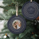 Dieses elegante Keramik-Ornament mit einem Foto auf der Vorderseite und einer Beschriftung auf der Rückseite, umgeben von einem dreifachen geometrischen Rahmen in Imitaten Goldfolie auf einem reichen marineblauen Hintergrund. Dieses schicke Design eignet sich perfekt zum Feiern eines besonderen Jahres oder eines besonderen "First".