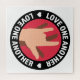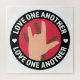 Zwei Hände (pfirsichfarben und braun) Sprichwort "I Liebe You" vor einem dunkelrosa Hintergrund in einem schwarzen Kreis mit weißem Text oben und unten Sprichwort "Liebe One Another".