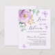 Ein weicher lila Hintergrund. Dekoriert mit einer lila und lila Rose und grünen, wasserfarbenen Eukalyptusgrün und Schmetterlingen. Personalisieren Sie Ihren Namen und Ihre Party-Daten und fügen Sie diese hinzu. Text: Liebe ist in Bloom. 1 Blatt = 1 Einladung mit Druckkante bis Kante.