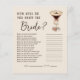 Mit unserem How Do You Know the Bride Brautparty Game können Sie Spaß bei Ihrem Fest machen! Dieses Spiel mit schönen Designs fordert die Gäste auf, Fragen über die Braut zu beantworten, von ihrem Lieblingsfilm bis zu ihrem Traumjob. Ideal, um das Eis zu brechen und zu lachen, ist es eine wunderbare Art, zu sehen, wer die Braut am besten kennt. Mit Eleganz und Charme gestaltet, sorgt dieses Spiel für ein unvergessliches und einladendes Brautparty für alle.