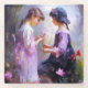 Ein KI-Gemälde von zwei Mädchen, die eine Blume bewundern. Ideal für ein Kinderzimmer- oder Mädchenzimmer.