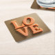 Dieser Untersetzer ist mit einem hübschen luxuriösen Hintergrund mit LIEBE in hellorangen Buchstaben und 3D-Effekt ausgestattet. Die Buchstaben haben eine niedliche Retro-Ästhetik mit abgerundeten Kanten und einem leichten Schimmer. Der Untersetzer ist ein Typografie-Kunststil. Der Untersetzer ist ein Untersetzer aus Papierhalbstoff. Das Untersetzer-Set enthält sechs Untersetzer.