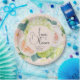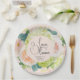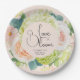 Die Wörter "Liebe in Blüte" und Ihre Brautparty-Details sind mit wunderschönen Aquarellen von weißen und grünen Hydrangeas mit rosa und cremefarbenen Rose, Gänseblüten, kleinen Blüten und Blätter auf diesem Papier Teller mit einem rot-rosa Hintergrund oder jeder Farbe, die Sie wählen. PASSENDE Artikel in unserer Sammlung.
