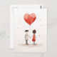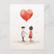 Eine minimalistische und herzerwärmende Abbildung eines Paares, das Hände hält, verbunden durch einen roten, herzförmigen Ballon, der über ihnen schwimmt. Das schlichte Design, die Aquarelltextur und die sanften Farbspritzen auf weißem Hintergrund verleihen dem Kunstwerk ein sanftes, traumhaftes Ambiente, das Liebe und Zusammengehörigkeit auf eine reine, unschuldige Art und Weise symbolisiert.