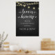 Liebe ist brauend, modern rustikal, Hochzeitsessen Probe Willkommenspender, im rustikalen schwarzen Chalkboard Hintergrund, Hütte Saitenleuchten thematisiert.