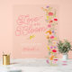 Liebe ist in blühenden Wildblumen florales Brautparty willkommen transparentes Zeichen mit hübschen handgemalten lebendigen und hellen orangen, rosa und gelben Blumen Aquarellbilder mit einer modernen eleganten Sprichwort-Schriftart-Liebe in Blüte, mit bohemianischem Grün. Ideal für Frühling, Sommer im Freien Garten Braut oder Hochzeitsfeier.