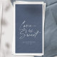 Genießen Sie die Süße Ihrer Liebe mit diesem eleganten Handtuch mit der Phrase "Liebe ist süß" in einem stilvollen Script-Schriftart. Der tiefe marineblau-blaue Hintergrund mit knalligen weißen Buchstaben schafft einen zeitlosen und raffinierten Look. Personalisiert mit den Namen des Paares und dem Hochzeitsdatum fügt dieses Handtuch Ihrem Hochzeitsempfang, Desserttisch, einer Verlobungsfeier oder einer Jubiläumsfeier eine romantische und raffinierte Touch hinzu. Ideal für einen Ort, ein Buffet oder einen Cocktail an den Stationen - ein schönes und funktionelles Detail, das Ihre Gäste schätzen werden.